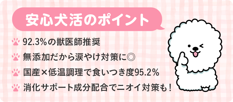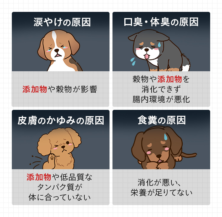 不要な成分が体に負担をかけ、涙やけや皮膚トラブルを引き起こす可能性があります。
